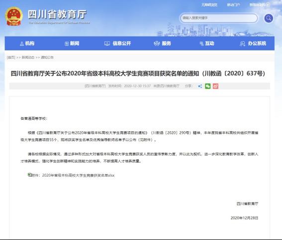 12月31日,2020年四川省大学生原创动漫大赛评审结果在四川省教育厅和四川省本科高校竞赛平台官网上陆续公布,我校学生取得佳绩,获得一等奖1项、二等奖2项、三等奖9项,南京、刘婉毅获得“优秀指导老师”。