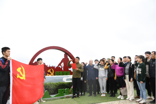 在蒋家坪村女娲凤凰茶叶现代示范园,全体党员面对党旗,在党总支书记樊仁杰的带领下,重温入党誓词,齐唱《没有共产党就没有新中国》。