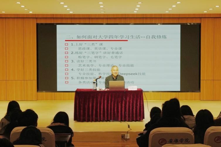 讲座伊始,孙海洋对我院各专业进行了详细阐释,明确强调了以立德树人作为根本任务,致力于培养德智体美劳全面发展的人才培养要求。同时剖析了艺术生大学四年的学习规律,并从上好“三类”课,练好“三笔”字,学好“三类技能”等方面对如何度过大学四年的学习生活给出建议。通过一系列丰富生动的事例,引导同学们拓展专业视野,坚定理想信念,守好意识形态底线。