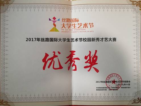 近日,在由中共陕西省委高教工委、中共陕西省委对外宣传办公室、陕西省教育厅、陕西省人民政府外事办公室、陕西广播电视台共同主办的2017年丝路国际大学生艺术节活动中,我院范义付副教授指导、学生郭宝宝和贾晓惠参与的朗诵节目《青春宣言》获优秀奖。