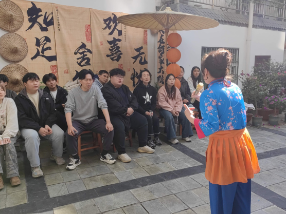 第二站大家来到紫阳民歌传承基地——何家大院,传承人何耀信、何显鹏带领紫阳民歌演唱团队热情地接待了安康学院师生一行。民歌演唱队演唱了多首地道的紫阳民歌,引得大家连连叫好。演唱中穿插表演了划旱船、玩蚌壳、赶毛驴等民俗节目。在互动环节,田川老师演唱了《我和我的祖国》,范义付老师演唱了《西部放歌》,还有多名学生演唱了各地民歌,精彩纷呈,使大家大饱耳福。演唱完毕,民歌演唱团队指导学生参与锣鼓队、划旱船、玩蚌壳、赶毛驴等节目表演,学生对紫阳民歌及民俗表演留下了深刻的印象。