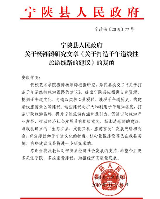 《陕南子午道文化景观构成分析与保护利用研究》是杨老师于2018年成功申报的陕西省教育厅人文社科项目,现已基本完成项目研究任务,并根据研究结果向宁陕县政府提出该建议,此次宁陕县政府的复函,是呻吟高潮内射在线服务地方的又一重要体现,是科研成果转化应用的又一例证,对促进我院教师服务地方经济社会发展发挥积极作用。