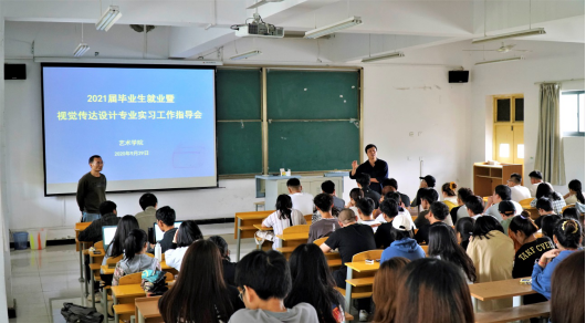 9月29日上午我院在江北校区2101教室召开了2021届视觉传达设计专业毕业生实习暨就业指导工作专题会。会议由辅导员杨厚东主持,邀请了设计系主任吴波参加,2021届视觉传达设计毕业生110多人到会聆听。