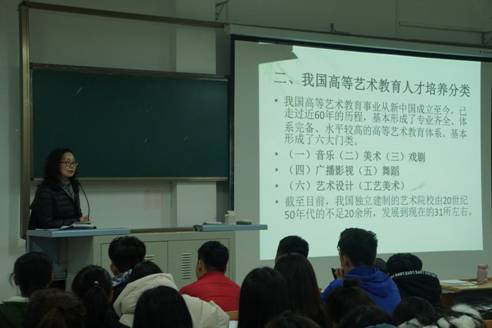鲍院长首先给大家讲解我国当前艺术类人才呈现的三个新特点:艺术类人才队伍不断壮大;艺术类人才层次结构比例逐渐趋于合理;传统艺术人才与现代艺术设计类人才并行发展,社会需求旺盛。接下来,鲍院长介绍了我国当前艺术高等教育人才培养的分类情况及艺术类专业的就业情况;并通过培养目标、专业培养能力要求、专业核心课程、就业方向等6个方面分别对我院所开设的美术学、音乐学、视觉传达与设计三个专业给同学们进行了详细解读。