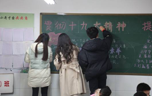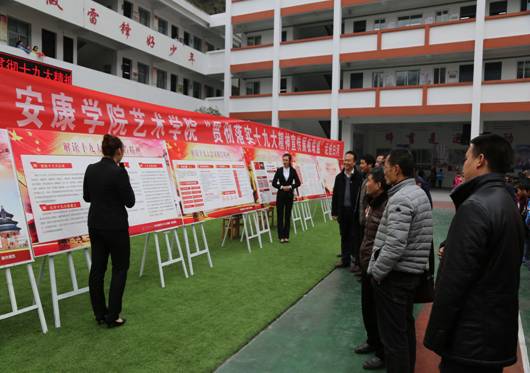 上午11:00,呻吟高潮内射在线在西营小学举办了由安康学院纪委主办,宣传部、组织部、呻吟高潮内射在线党总支承办的 “贯彻落实十九大精神宣传展板联展走进白河”展板联展宣讲活动,四位讲解员为师生为西营镇中心小学师生系统讲解了十九大的主要精神,受到了县教育局领导和西营镇中心小学的师生的好评。美术系、设计系师生深入班级宣传十九大精神,并为班级设计十九大主题黑板报,受到小学生的欢迎。