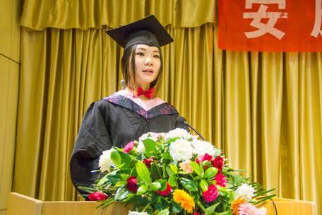 随后艺术设计2010级2班国家奖学金获得者、优秀毕业生谭翠平同学代表全体毕业生做了发言。她首先表达了对母校的恋恋不舍之情,对同窗的依依惜别之感,感谢老师四年来的悉心教导和精心培养!她说:毕业是大学四年的完美谢幕,也是下一段旅行的郑重开始。让我们牢记“笃学、尚行、励志、创新”的校训,带着老师最真诚的期望,带着同学们最美好的祝福向未来起程。衷心祝愿所有老师身体健康、工作顺利家庭幸福。共同祝愿艺术系更加蓬勃发展,祝安康学院明天更美好!