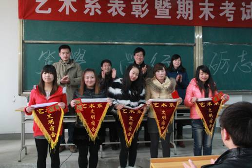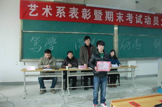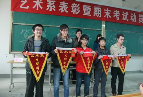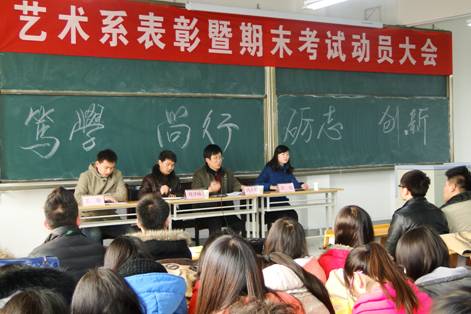 为了进一步夯实我系学风建设,2013115号下午16:00,我系在江北校区1301教室召开了“艺术系表彰暨期末考试动员大会”。莅临大会的有系党总支书记冯丰收,系学工办主任刘泽桢,系团总支书记黄娟。会议由辅导员王毅主持。2012 级全体学生和学生会干部参加了会议。