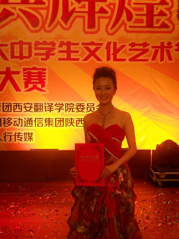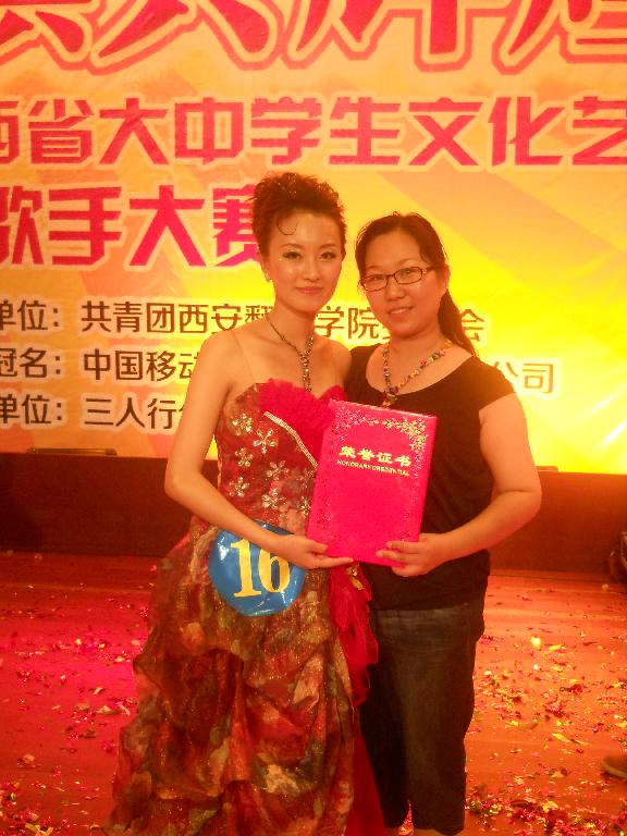 2012年6月6日晚,由共青团陕西省委员会、中共陕西省委教育工委、陕西省学生联合会主办,共青团西安翻译学院委员会承办,三人行传媒协办的“动感地带”杯第23届“校园之春”陕西省大中学生文化艺术节陕西省大学生歌手大赛在西安翻译学院大礼堂隆重举行。本次大赛分为专业和非专业两组,来自全省多所高校的20支代表队参赛,选手经过了重重关卡脱颖而出,最终获得当晚大赛的入场卷。我校艺术系09级音乐学学生柳静同学在指导教师李磊老师的陪同下参加最后的决赛,柳静同学以一首《山里的女人喊太阳》震撼全场,荣获专业组二等奖的优异成绩,再创佳绩,为我校争得了荣誉。