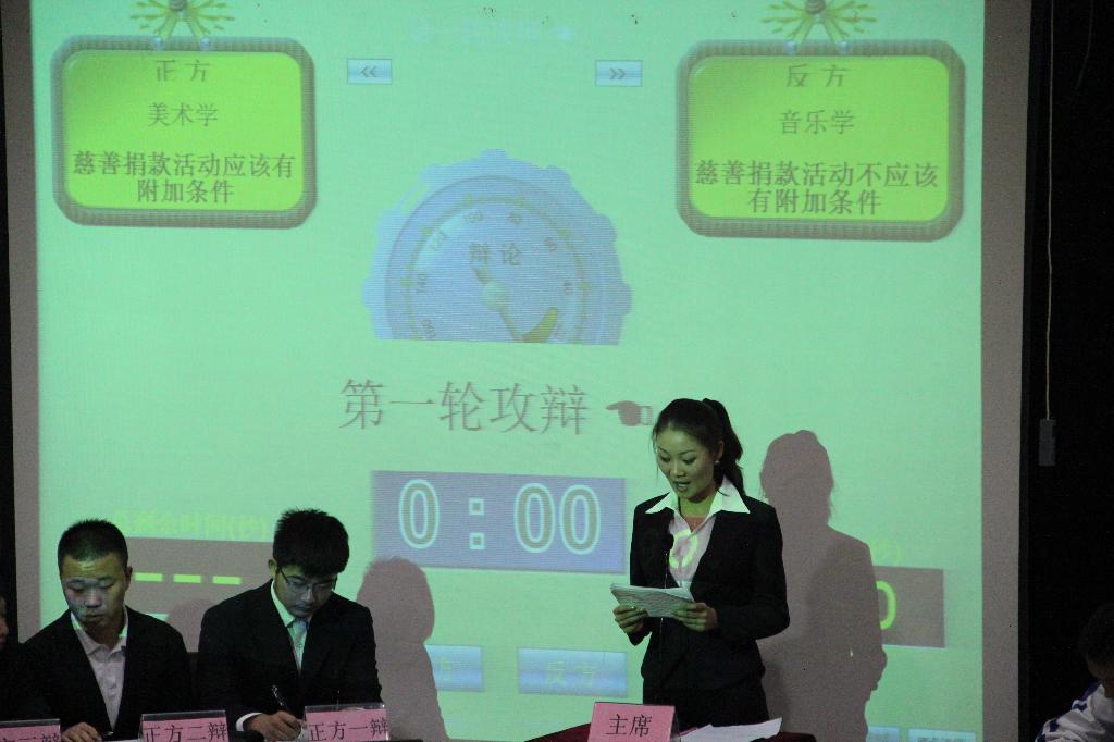 开赛后,比赛的烽火即刻点燃。继正方慷慨激昂、反方充满理性色彩的自我介绍后,比赛进入开篇立论环节。正方美术学的一辩通俗易懂的语言陈述己方观点;反方音乐学代表队应用辩证唯物主义等科学观点进行层层剖析。在进入自由辩论环节,正方辩手们举事实、讲道理,措辞精辟,言辞犀利,展现出咄咄逼人的气势。反方辩手也毫不示弱,他们通过辩证法、反证法等多种方法、多角度地论证了己方观点。正反双方辩手观点鲜明的立论、引经据典的一对一攻辩、争锋相对的自由辩论和精辟透彻的总结陈词把现场气氛一次次推向高潮,双方辩手紧扣主题的立论、有理有据的辩驳、风趣幽默的语言赢得观众掌声阵阵。经过评委公正公平的评判,美术学代表队获得本次辩论赛的冠军,音乐学代表队获得亚军,祁宏斌、陈霞、李红梅等三位同学获得最佳辩手的称号。