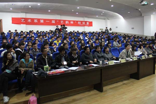 2011年11月6日晚7:30分,艺术系首届“艺韵杯”辩论赛总决赛在我院一号楼六楼报告厅成功举行。我系党总支书记冯丰收老师、辅导员刘泽祯老师、黄娟老师、王毅老师,王胜选老师莅临会场并担任评委。我系各级学生代表近200人现场观摩了比赛。
