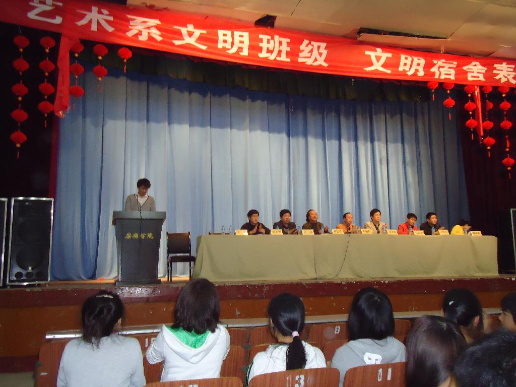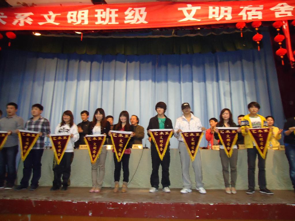 4月10日晚上19:30,艺术系2010-2011学年文明班级、文明宿舍表彰大会在东校区大礼堂隆重举行。艺术系领导单福东、冯丰收、章长青等主席了表彰会,各班级辅导员、班主任和500多名在校学生参加了会议,会议由辅导员王毅老师主持。
