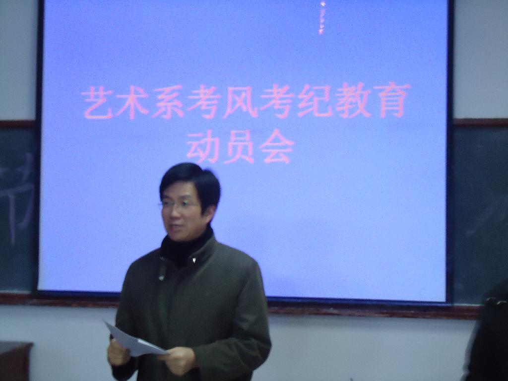 为了进一步加强学风建设,以考风带动学风,培养学生诚信做人的意识,艺术系党总支于2011年1月7日10:00,在四号教学楼三楼多媒体教室,广泛开展了“抓考风,促学风”主题教育活动,艺术系党总支书记冯丰收参加了会议,学生党支部王胜选老师组织学生党员、预备党员和入党积极分子80余人参加了本次活动。