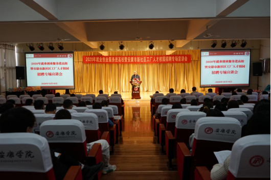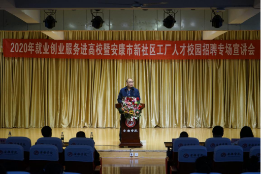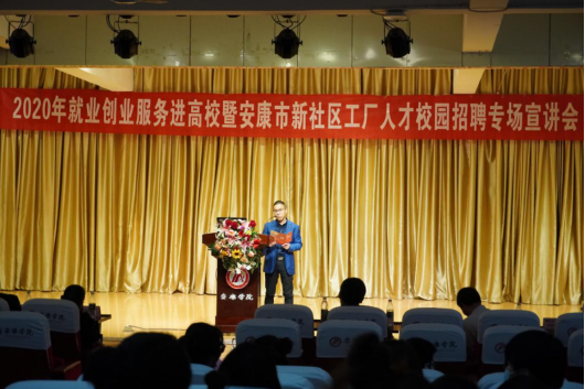 为进一步推进我校2021届毕业生就业创业工作,宣传普及大学生就业创业政策;帮助毕业生进一步了解就业市场,树立正确的择业观、职业观,积极理性求职,合理规划职业发展;同时,也为给安康市新社区工厂小微企业更好发展招聘紧缺实用人才,10月19日下午,呻吟高潮内射在线、电信学院与安康市人社局、市毛绒玩具产业协会一起在江北校区1401多功能演艺厅共同举办了2020年就业创业服务进高校暨安康市新社区工厂小微企业人才校园招聘专场宣讲活动。市毛绒玩具文创产业领导小组办公室副主任刘应祥、市人社局副局长王建华、市毛绒玩具行业协会会长沈爱华、市新社区工厂相关负责人及招生就业处副处长郑武斌、电信学院党总书记于咏梅、呻吟高潮内射在线副院长鲍丽以及呻吟高潮内射在线设计、美术专业和电信学院电子信息工程、计算机等相关专业180余名2021届毕业生参加了此次招聘宣讲活动,呻吟高潮内射在线党总支书记樊仁杰主持了会议。