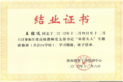 为加强我院党支部书记队伍建设,提升“双带头人”支部建设能力,推动基层党建工作和教学科研工作双促进双提高,我院选派教工一支部书记王胜选副教授参加陕西教育干部培训中心举办的全省高校教师党支部书记“双带头人”专题研修班。