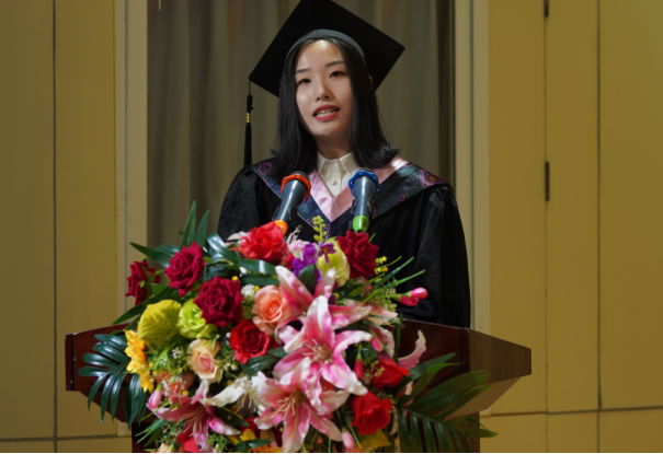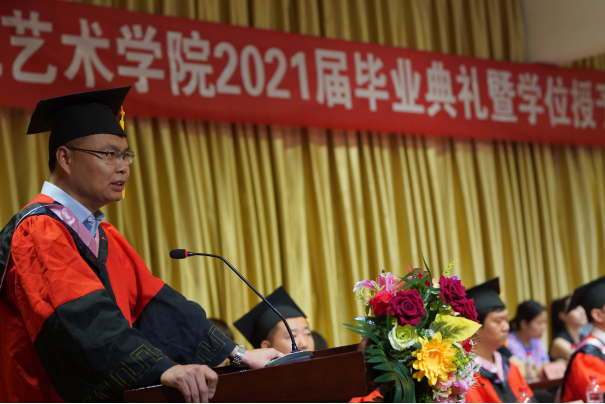 2021届视觉传达设计专业毕业生王淇代表毕业生对学校及老师的培养表示感谢,一定铭记老师们的殷切希望和深情嘱托,做胸怀大志、脚踏实地之人,成就更好的自己,为母校争光添彩。