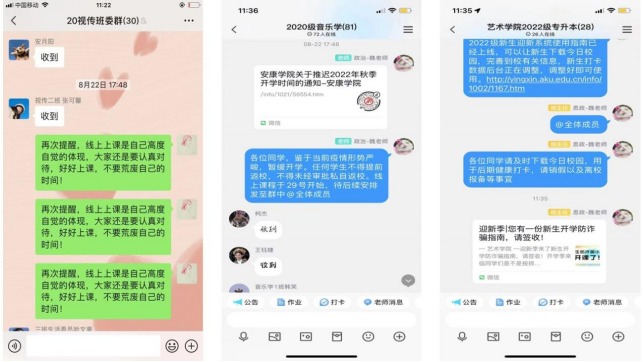 为全面做好疫情防控工作,确保学生正常进入学习状态,保障线上正常教学秩序,并帮助新生建立班级关系、提前了解大学生活,做好入学准备工作,为此,全体辅导员依托微信群、“腾讯会议”等平台,分别给2019级、2020级、2021级学生以及2022级新生召开了“2022年秋季线上开学第一课”主题班会。围绕收心复学、安全教育、疫情防控等内容,教育引导学生居家上好网课,遵守属地疫情防控管理要求,谨防电信网络诈骗,共同迎接新学期的到来。