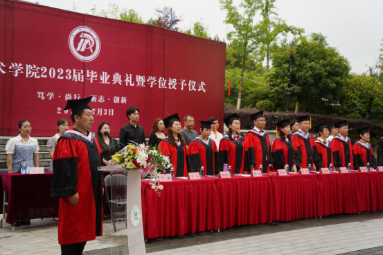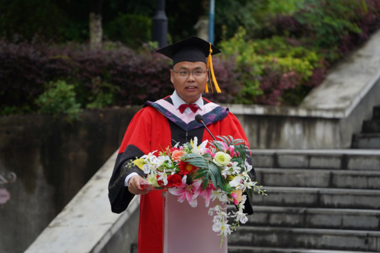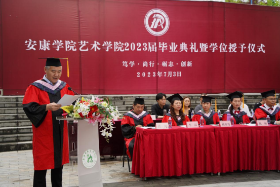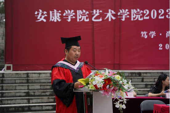 院长成党伟在致辞中代表学院向圆满完成学业的毕业生表示热烈祝贺,向毕业生们提出三点希望:一是希望同学们怀揣梦想,要有“会当水击三千里、自信人生二百年”的豪气,笃定自信,勇敢地面对未来的挑战,书写人生底色。二是希望同学们脚踏实地、做奋斗者,在自己的岗位上奋力拼搏,为青春添彩,彰显人生本色。三是希望同学们不忘初心、把小我深度融入祖国发展的大我中,踔厉奋发、勇毅前行。在国家发展的进程中展现安康学院人应有的家国担当,绽放人生亮色。要求同学们不要忘记做一个对人感恩、对己克制、对物珍惜、对事尽力的人,在人生道路上站得高、立得正、行的稳、走得远。