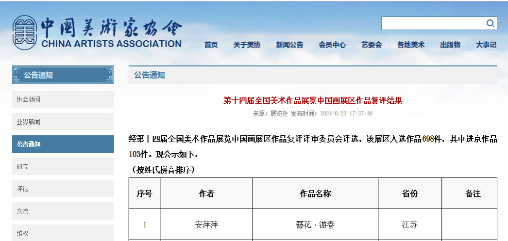 6月23日,中国美术家协会发布“第十四届全国美术作品展览中国画展区作品复评结果”,入选作品698件,我院章长青老师1件作品《高速时代》入选。