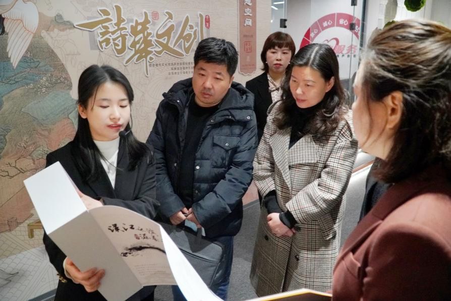 在企业相关负责人的陪同下,黄娟一行首先参观了以安康文化为背景打造的企业文化展厅——诗华文化城市文创会客厅。通过沉浸式的体验和详尽的讲解,深入了解了诗华文化在文化传承、文化创意、文化空间、文化交流、营销策划和文旅融合等领域的创新成果和应用案例,为我院一行呈现了设计行业打造复合型文化综合体的未来图景。