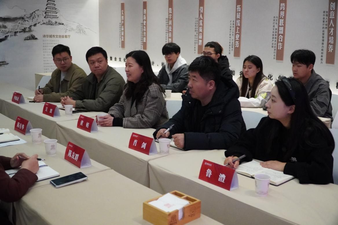 参观结束后,双方进行了座谈交流。陈有华对我院一行的到访表示热烈欢迎,并介绍了诗华文化在艺术设计领域的技术优势和成功案例。她表示,诗华文化一直致力于推动文化创意设计与文创产品开发的数字化转型,并积极参与高校人才培养工作。她希望通过与学院的合作,能够将行业最新技术和实践经验引入高校课堂,培养出更多适应时代发展需求的高素质设计人才。黄娟在交流中指出,在数智化浪潮重塑产业生态的当下,大数据、AI等新技术的应用倒逼课程体系重构,学院人才培养必须与以诗华文化为代表的行业领军企业开展合作,构建融合培养范式,真正打通从课堂到产业的人才供给链。