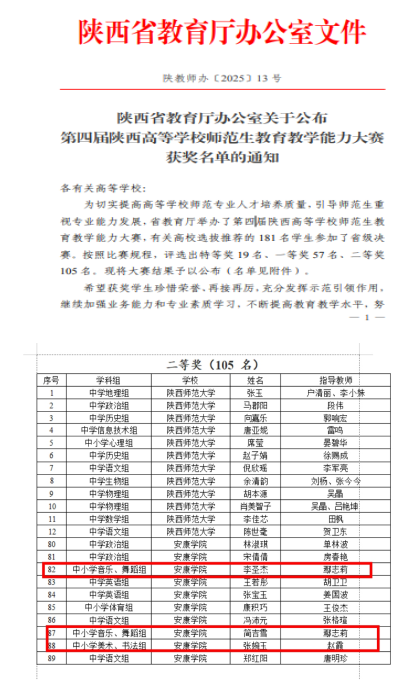 近日,第四届陕西高等学校师范生教育教学能力大赛在咸阳师范学院举行,我院2021级音乐学专业李圣杰、2022级音乐学专业简吉雪、2022级美术学专业张婉玉三位同学凭借扎实的专业知识、出色的教学设计和现场表现,在众多参赛者中脱颖而出,成功进入决赛并荣获二等奖。
