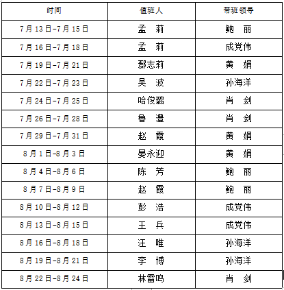注:值班人员严格做好值班工作。遇到重大事件及时向带班领导汇报;若收到信件不得私自拆封,急件或密件须交带班领导或院办公室主任;值班期间24小时必须保持信息畅通,手机为值班电话,如遇突发事件,必须在第一时间向值班领导报告。