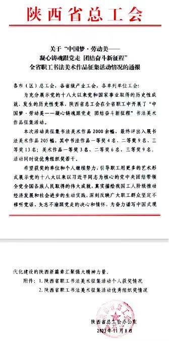 我院原春鸣老师在陕西省 “中国梦·劳动美”全省职工书画大赛中获二等奖。